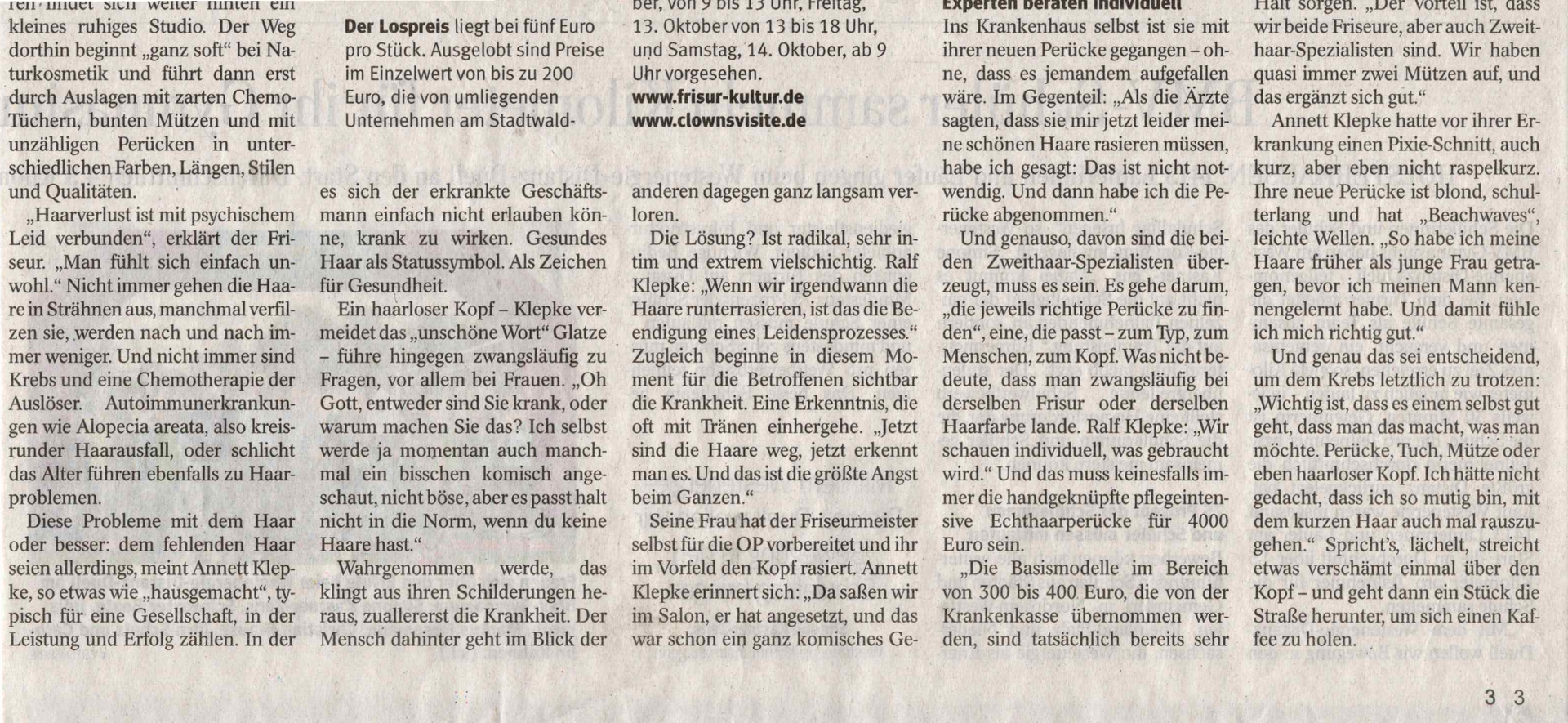 Im Friseurladen von Ralf Klepke arbeitet auch seine Frau. Genau wie er hat sie sich im Bereich Zweithaar weitergebildet. Im Januar vergangenen Jahres der Schock: In ihrem Kopf wächst ein bösartiger Hirntumor. Nach der Diagnose folgte eine OP. Dafür mussten vorher einige Haare weichen. Die 47-Jährige entschied sich für eine komplette Rasur. Die übernahm ihr Mann. Von da an trug sie Perücke. Auch im Krankenhaus vor dem Eingriff hatte sie ihre neuen künstlichen Haare auf. Die Essenerin erinnert sich noch genau an die Reaktionen der Mitarbeiter in der Klinik: „Die dachten, es wäre mein eigenes Haar. […] Und das würde so schade sein. Es ist nicht schade. Und dann habe ich die Perücke runtergenommen und die schauten dann ganz verdattert.“